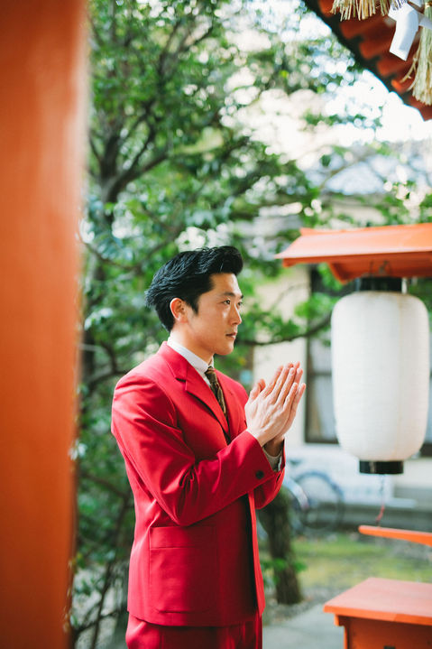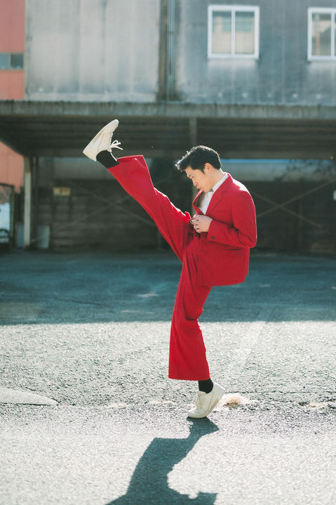 今回こだわったのはジャケットの丈とボトムの太さのバランスです。真っ赤なカラーとストレッチが効いている生地で動きやすいです」